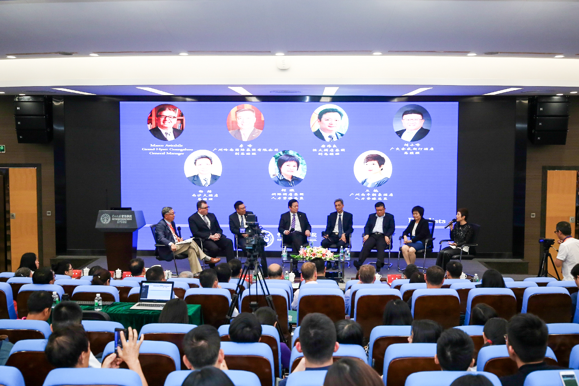 校友论坛环节由学院特聘教授屈海林主持。广州岭南国际集团有限公司副总经理李峰、恒大酒店集团副总经理唐伟良、广交会威斯汀酒店总经理刘小峰、南沙大酒店总经理杨结、广州南丰朗豪酒店人力资源总监王艳、洲际酒店集团人力资源总监柯璇、广州君悦大酒店总经理Marco Avitabile作为嘉宾出席了本次论坛。