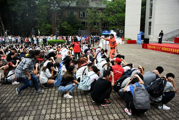 为做好本次演练,以“树立防震新理念,提高防抗救能力”为主题的防震减灾培训于5月4日和5月11日分别在我校广州校区南校园、东校园举行,先后有来自中文系、哲学系、地理科学与规划学院、国际翻译学院、岭南学院、生命科学学院、化学学院、外国语学院、物理学院、政治与公共事务管理学院的950多名同学参与培训,同学们对紧急避震、生命三角区、地震逃生、防踩踏等知识进行了系统学习。 大学“纪念汶川地震十周年系列活动”是以习近平总书记在河北唐山考察提出的“两个坚持、三个转变”的新时期防灾减灾新理念为指导,旨在进一步增强广大师生防震减灾意识,提升广大师生防震减灾知识水平和和公众应急避险与自救互救能力,减少生命财产损失,不断提高我校应急疏散演练的组织能力和管理水平,为我校的双一流建设提供安全保障。