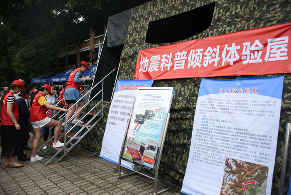 同学们体验地震科普倾斜屋