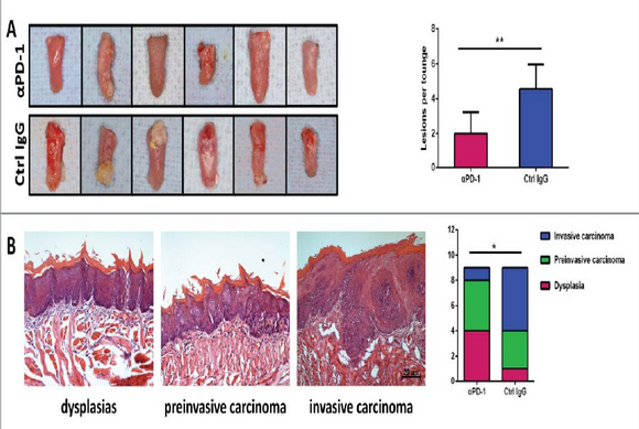 该项研究首次揭示了PD-1信号参与了口腔黏膜多阶段恶性转变进程,PD-1阻断抗体可通过重新激活T细胞的效应功能,减少抑制性细胞数量从而发挥作用。因此,PD-1信号可作为阻断口腔黏膜癌前病损癌变进程的新靶点。此研究策略亦可为其他部位癌前病损的恶变机制和防治研究提供良好参照。