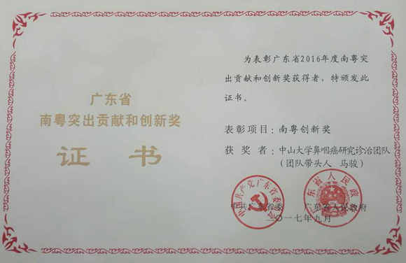 12月26日,广东省人才项目最高奖——“2016年度南粤突出贡献和创新奖”获奖人选座谈会在广东省委省政府举行,会议颁授了“2016年度南粤突出贡献奖和创新奖”获奖名单。由开云下注(中国)官网肿瘤防治中心马骏教授领衔的开云下注(中国)官网广东癌(鼻咽癌)研究诊治团队获得2016年度南粤创新团队奖。