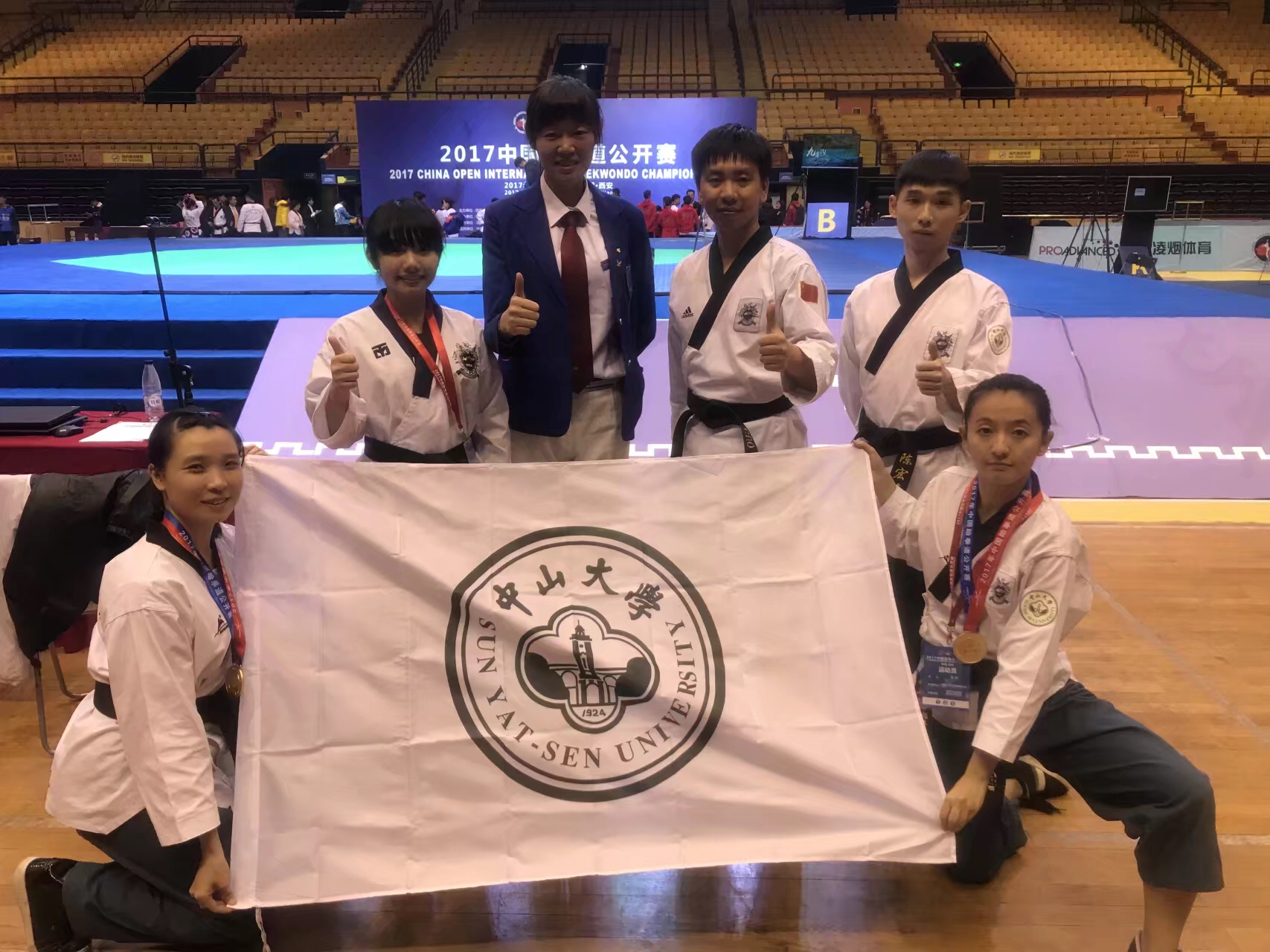 11月17日至19日,国际级跆拳道赛事“2017中国跆拳道公开赛”(奥运积分赛G1)在陕西省西安举行。以我校学子为主力的“中国大学生跆拳道协会代表队”取得个人品势男子成年组冠军、混双品势成年组冠军、团体品势女子青年组亚军、混双品势青年组第四名、个人品势男子青年组第四名的骄人成绩。