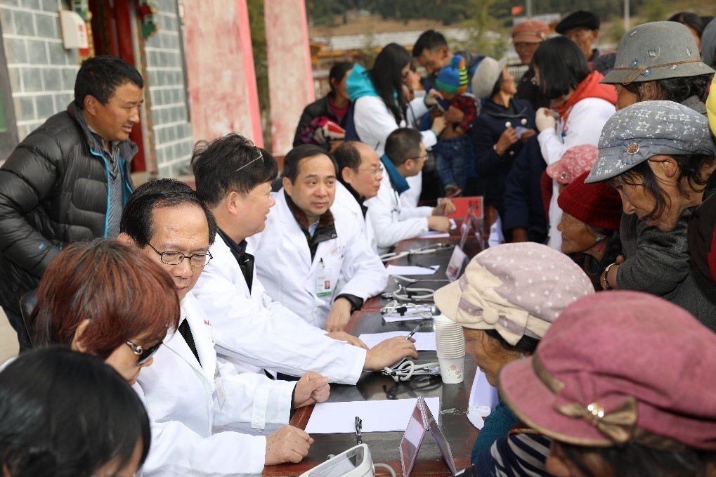 在场的几位专家教授们则仔细聆听老乡们的描述,努力辩听着他们生涩的藏式普通话,遇着沟通障碍时,就求助当地村医、村官帮助。专家们时不时给他们听诊,做局部体格检查,并开出相应的用药医嘱和给予进一步的治疗意见。