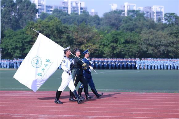 是日,校园里艳阳高照,一路引燃参训新生的高昂士气。学子们口号嘹亮、军容严整、英姿爽飒,一展军训风采,接受军训成果检验。伴随着激昂的《解放军进行曲》,护旗手昂首自信、脚踏正步、身披戎装,校旗迎风飘扬,昭示着中大新生的爱国爱校之情。分列式中,各方队依次整齐走过,接受检阅。同学们带着自信与坚毅,矫健的步伐刚正划一,象征着青春的傲骨;坚定的目光炯炯有神,散发着青年的朝气。