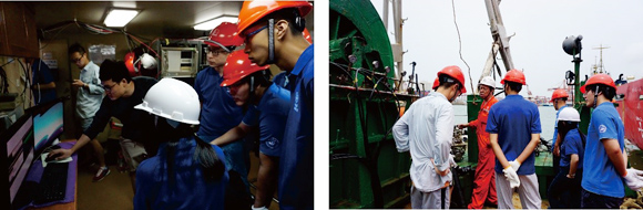 7月31日,地质地球物理及大气科学研究人员于深圳蛇口码头登船。31日下午,在船方的协助下,完成了仪器的固定及调试。该航段地质和地球物理工作共分两个部分进行,第一个部分主要进行地球物理的数据采集,第二部分进行地质采样工作。在所有仪器安装调试完毕后,8名船员在该航段首席兼领队、地球科学与工程学院杨小强教授带领下进行了安全培训及演习,并成立了海上临时党支部。8月1日早上,我校科考队员在船方的带领下参观了驾驶室及地球物理高分辨率多道地震仪器。在确认海况后,该船于8月1日中午12:00准时启航。