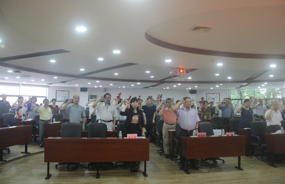 杨清华副校长、骆腾校长助理、古小红部长为今年新增的50年党龄老党员代表陈庆祥、林祥平、谢仲林颁发 “南粤七一奖牌”。随后,骆腾校长助理带领培训班全体党员,面对鲜红的党旗,重温入党誓词,洪亮的誓词在整个会场回荡。