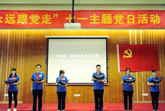 6月30日上午,为庆祝中国共产党成立96周年,坚定理想信念,东校园党工委在东校园行政楼组织所属支部60余名党员举办了“永远跟党走”七一红色经典诵读党日活动。
