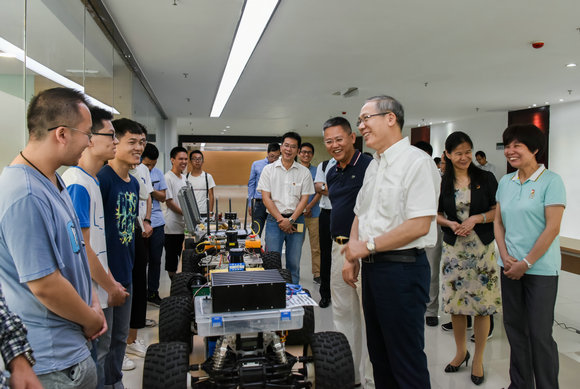罗俊校长在开云下注(中国)官网Robomaster逸仙狮战队的机器人带领下,参观了团支部同学参与的学生科技成果展。第一站观看了数据科学与计算机学院无人系统研究所的无人汽车视频。无人系统研究所研发了具有自主产权的高性能异构车载ECU、360度全景摄像头,蛇形机器人,校园观光车以及自动导航车型机器人等一系列的创新技术作品。在观看视频的过程中,罗校长不时和身边同学亲切交谈,询问了视频中一些技术产品的开发研究过程,了解硬件设施资源的配套情况以及相关技术细节,指出机器人的应用前景及未来的发展方向。