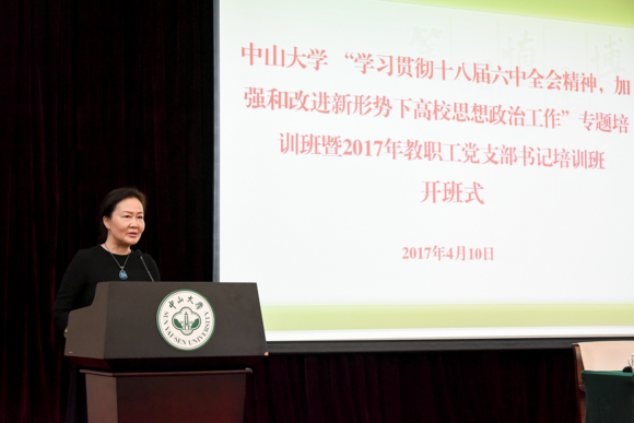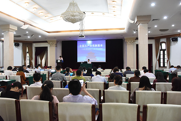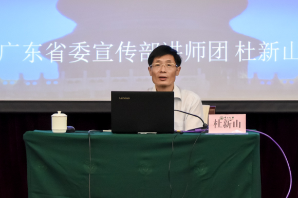 4月10日上午,按照学校“两学一做”学习教育的工作部署,我校在广州校区南校园召开了学习贯彻党的十八届六中全会精神专题报告会。报告会邀请广东省委宣传部讲师团团长杜新山作专题报告。报告会前,举行了“学习贯彻十八届六中全会精神,加强和改进新形势下高校思想政治工作”专题培训班(第1期)和2017年教职工党支部书记培训班开班式,校党委副书记李萍出席并致辞。两个培训班的学员近140人参加。