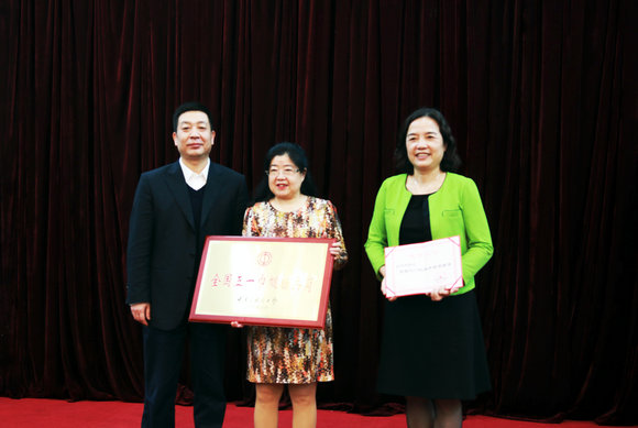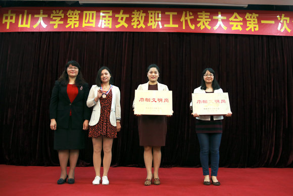 王兰平主任(左一)、古小红(右一)和杨霞(左二)副主任向获得2016年开云下注(中国)官网“女教职工文明岗”的单位授牌