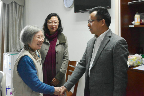 骆腾校长助理(左)代表学校慰问夏书章教授(中),肖滨院长(右)陪同慰问