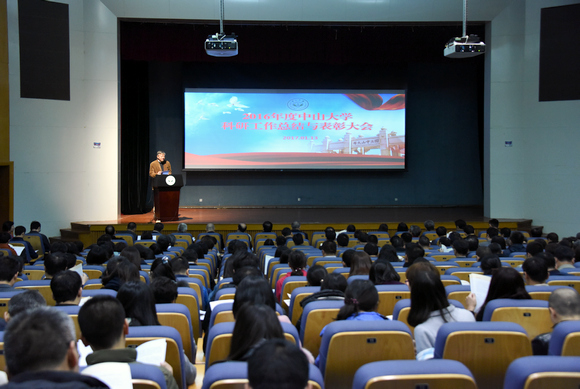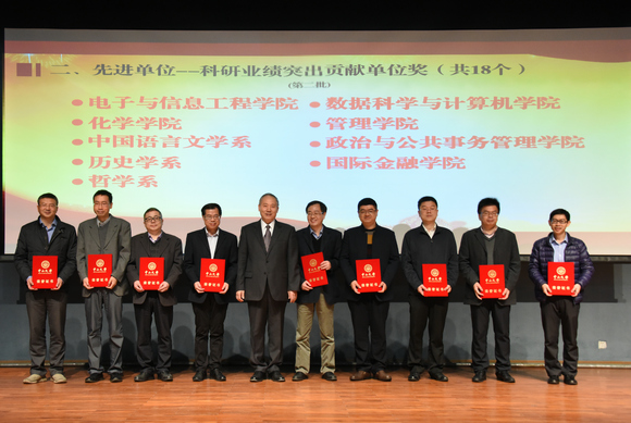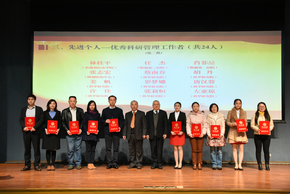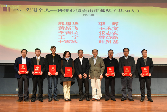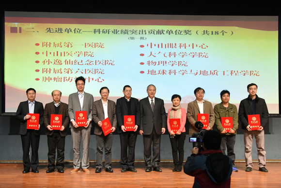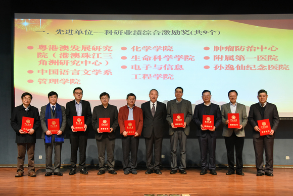 会议表彰了在学校科研工作中做出突出成绩和贡献的单位和个人。中国语言文学系主任李炜、数据科学与计算机学院院长钱德沛、孙逸仙纪念医院院长宋尔卫、肿瘤防治中心教授徐瑞华、海洋科学学院教授杨清书、国际金融学院教授黄新飞、中山眼科中心科技处副科长曹京京受邀作典型经验介绍。