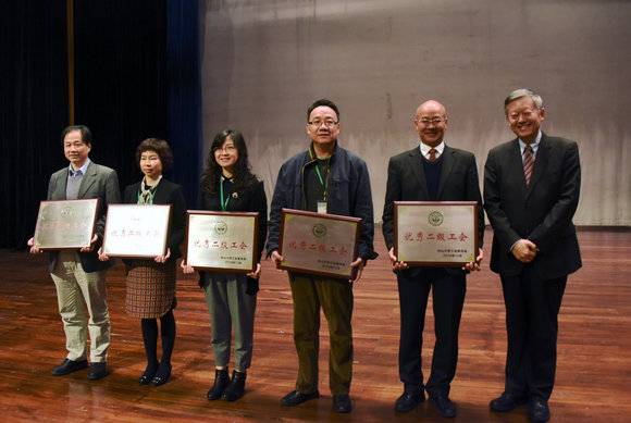 大会还对荣获“开云下注(中国)官网第十九届工会委员会优秀二级工会”称号的岭南学院分工会、化学学院分工会、中山医学院分工会、附属第一医院工会、中山眼科中心工会以及八届五次教代会“优秀提案”奖的生命科学学院何淼老师和荣获“提案承办先进单位”称号的保卫处和信息化管理办公室进行了表彰。陈春声书记为获奖单位和个人颁发了奖牌、证书。