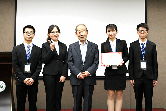 图为比赛一等奖获得者广西师范大学代表队(中为庄建平教授)