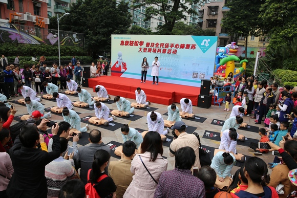 12月10日上午发生在员村天河都市广场的这紧张一幕,是附属六院联合《广州日报》“健康有约”及全媒体部门共同举办的“急救轻松学——普及全民徒手心肺复苏”大型现场科普活动上的情景剧。这一大型医疗公益宣教活动,吸引了近两百名市民驻足观看、学习,同时还在广州日报app上进行了全程直播。此外,还有包括G4出动,经视报告,珠江新闻眼以及630新闻等四个栏目组在内的四家电视台对活动进行了相关报道。