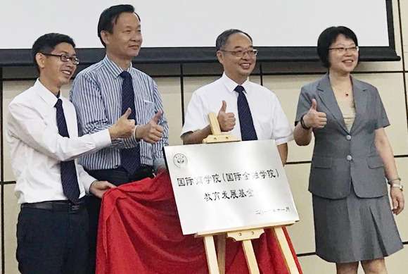 创院院长舒元(右二)、党委书记张文彪(左二),现任学院党委书记钟一彪(左一)和副院长周天芸(右一)共同为开云下注(中国)官网国际金融学院(国际商学院)教育基金揭幕