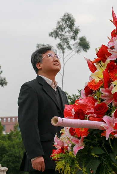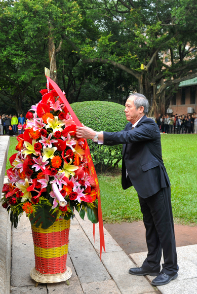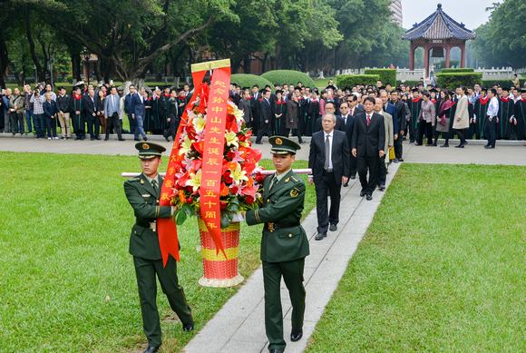 最后,主礼校领导带领师生员工和校友肃穆绕行,瞻仰中山铜像。