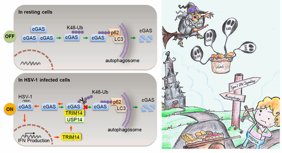 细胞自噬是真核生物体内降解蛋白、细胞器以及外源微生物的一项基本生理活动,与诸多生理病理过程密切相关。最近的研究揭示蛋白修饰,特别是泛素化修饰参与了细胞自噬信号通路的激活和选择性自噬的底物选择。联合课题组发现cGAS的K48-连接泛素化是依赖于货物受体p62的选择性自噬降解的一种识别信号,而TRIM14-USP14通过去除cGAS的泛素化,使得更多的cGAS不被自噬溶酶体选择性降解,从而参与到抗病毒免疫的信号激活中。这些研究结果揭示了TRIM14对DNA病毒介导的抗病毒免疫的正向调控作用,并对天然免疫中自噬与I型干扰素信号之间的串扰(crosstalk),提供了新的见解。