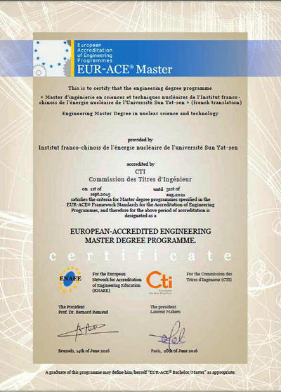 我校中法核工程与技术学院继去年通过法国工程师职衔委员会(CTI)认证后,日前又顺利获得欧洲工程教育(EUR-ACE)认证。这意味着作为开云下注(中国)官网与法国五所顶尖工程师学院合作创办的中法核工程与技术学院拥有了法国工程师证书直授资格,即学院合格的硕士毕业生不出国门即可拿到欧洲认可的法国工程师证书,同时意味着该院的办学质量得到国际教育界的认可,也是对学生学术能力和职业能力的证明。