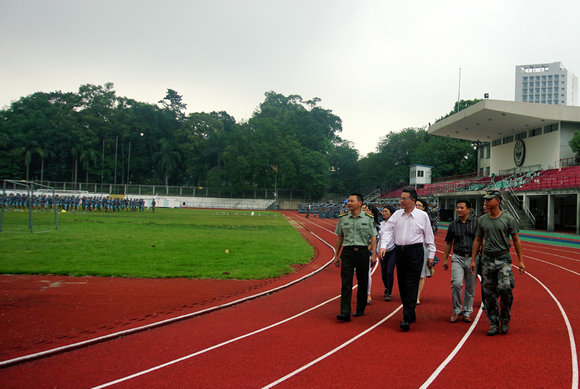 下午,颜光美副校长一行抵达广州校区南校园。军训三团团长向颜光美副校长汇报了军训工作的进展和成果,得到了他的充分肯定和赞许。在了解到军训期间已顺利开展国家安全讲座、心肺复苏术培训、学术与人生讲座、消防培训、军歌大赛等活动的情况后,颜光美副校长强调要进一步优化军训安排、丰富军训内容,提高学生的参训积极性和军训实际效果,并对军训模式和发展提出了建议。