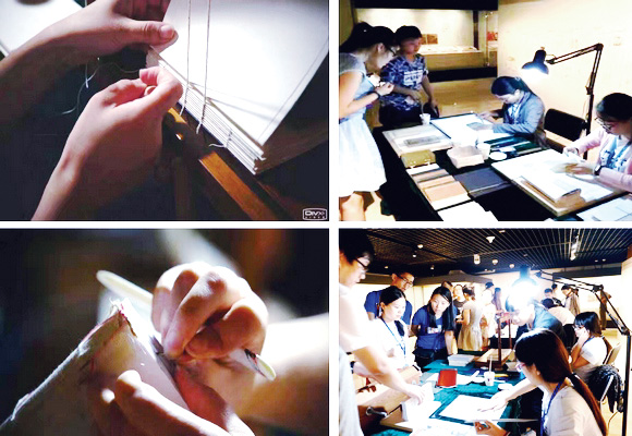 本次展览适逢国务院公布第五批《国家珍贵古籍名录》,并响应习近平总书记提出的“让书写在古籍里的文字活起来”的号召,由文化部、国家文物局联合主办,国家图书馆(国家古籍保护中心、国家典籍博物馆)承办。为了更好地展示古籍修复技艺,给参观者更加真切的体验,国家古籍保护中心邀请我校与复旦大学文献修复方向的专业硕士研究生在展览上进行中西文书修复与装订技艺的现场演示。演示内容主要有西文精装书的装帧步骤、中文线装书的装订和古籍破损书叶的修复。