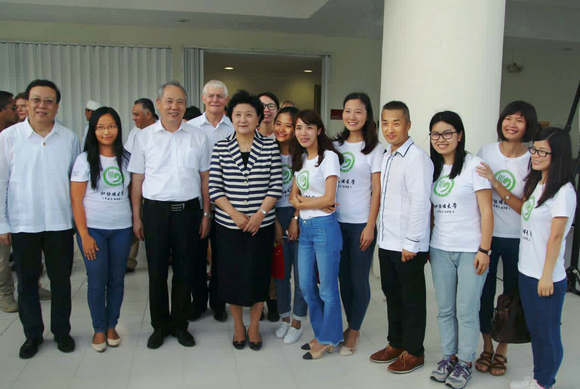 刘延东副总理(前排左四)、罗俊校长(前排左三)与我校派驻墨西哥的汉语教师及志愿者合影留念