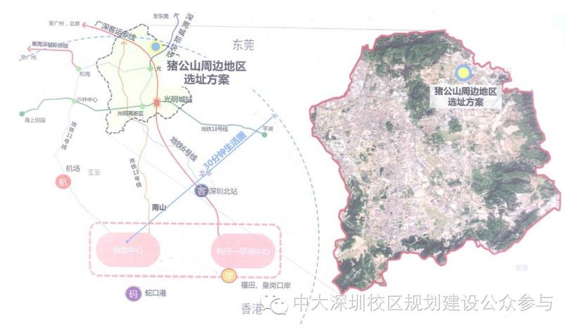 四、校区选址:位于深圳市光明新区公常路以北,康弘路以东,羌下二 路以西,与东莞黄江接壤的猪公山周边区域。
