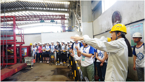 在工作人员的带领下,营员们参观了世界最大的现代化沉管预制工厂,了解世界首创半刚性结构沉管的生产线,如钢筋绑扎、混凝土浇筑、沉管顶推。据介绍,截止至7月12日,工程建设团队已顺利实现了E28管节的水压接作业,标志着港珠澳大桥岛隧工程完成了最后一根直线段管节的安装,隧道里程4860米。