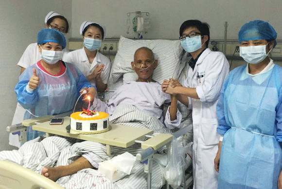 “五一”劳动节期间,在中山三院岭南医院肝脏移植中心,伴随着生日快乐歌传来一阵阵的欢声笑语。这是科室的医护人员在为刚刚做完肝移植手术转入普通病房的冯先生庆祝70大寿。