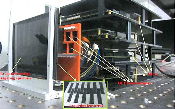研究组采用OLED微显示屏和创新性的光学结构,在所研制的样机上成功验证了技术的可行性。该技术不但大幅降低光场技术对显示系统带宽的要求,更具价值之处在于其具有薄的光学结构,首次使光场三维界面在智能手机上的应用成为可能。该研究成果发表在光学工程领域的权威期刊《Optics Express》(24:4421-4430,2016),成为该期下载最多次的文章,并被OSA和AIP联合推荐至著名科学媒体Phys. Org.进行了题为“Shrinking 3D technology for comfortable smart phone viewing”专访报道。