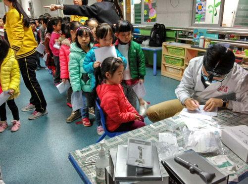 义诊现场,附属六院耳鼻咽喉头颈外科魏凡钦医师、肖志文医生、张帅技师、睡眠障碍专科林敏敏技师以及天河区残联杨老师,一同对小朋友进行了耳鼻咽喉科检查、测评幼儿身体发育情况等。义诊中对于有耵聍栓塞的小朋友,医务人员建议到医院取出耵聍后再做相应听力筛查;对于扁桃体肥大、鼻塞、睡眠打鼾、张口呼吸的小朋友,家长应引起注意及时带幼儿到医院就诊。
