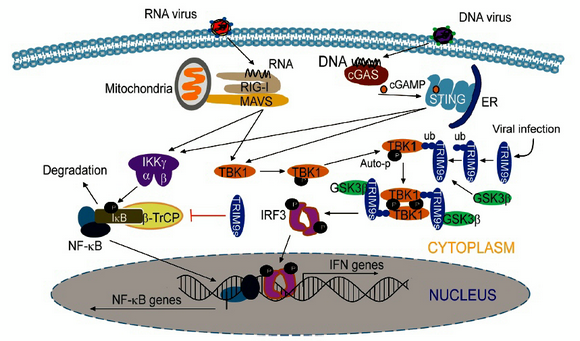 在DNA受体cGAS和RNA受体RIG-I与MDA5识别病毒DNA和RNA所介导的抗病毒天然免疫信号中,I型干扰素的表达是建立细胞抗病毒免疫反应的关键。这些DNA和RNA受体在激活后,可分别招募适配体蛋白STING和MAVS引发下游的信号转导级联反应。STING和MAVS依赖性的信号级联反应随后招募及激活抗病毒免疫中的关键激酶TBK1,然后激活下游的转录因子IRF3/7和NF-?B,介导I型干扰素的表达和释放。然而目前为止对于调控TBK1激活的机制仍知之甚少。