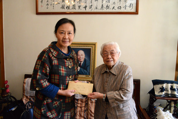 李萍副书记接收陈子扬同志遗孀陈明女士(右)转交的特殊党费