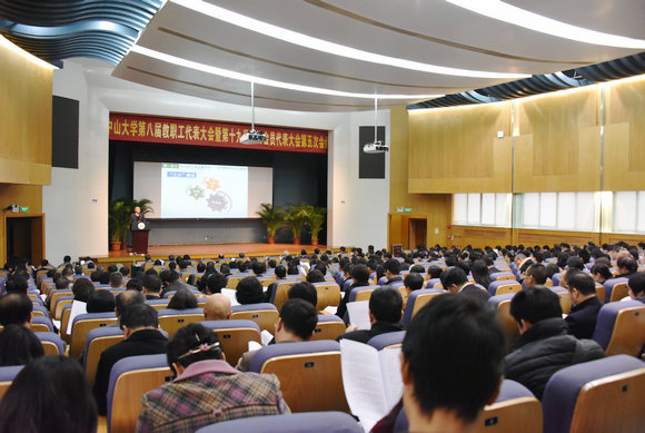 1月18日下午,我校第八届教职工代表大会暨第十九届工会会员代表大会(简称“双代会”)第五次会议在广州校区南校园第三教学楼召开。我校计亮年院士、苏锵院士,校领导罗俊、李萍、黎孟枫、魏明海、国亚萍、李善民、朱熹平、余敏斌、陈绍斌、程焕文、杨清华、田辉玉出席了本次会议。来自47个“双代会”代表团的近400位正式代表、特邀代表和列席代表参加了会议。大会由党委副书记、纪委书记国亚萍主持。