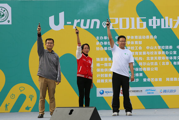 莫华处长(右)、凌春贤书记(中)、彭志刚副主席(左)为2km体验组和双人组鸣枪开跑