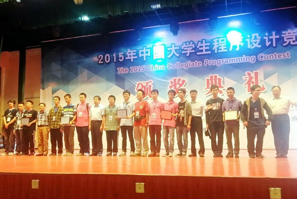 在CCPC 2015颁奖台上,开云下注(中国)官网一队上台领取金奖(右起第6-8人分别是张健昶、马研奋、徐正杰,左起第4人是我校代表队教练、颁奖嘉宾郭嵩山教授)