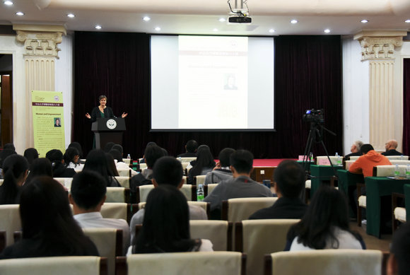 吴百纳大使在怀士堂向我校师生做了题为“女性与赋权”的主题演讲。作为英国首位女性驻华大使,她介绍了自己在英国外交部的奋斗史,分享了对女性赋权的思考,并在提问环节与现场师生进行了积极的交流互动。