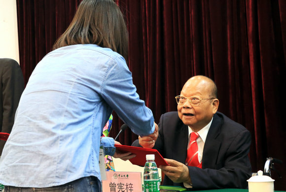 曾宪梓表示,在中大度过了四年的大学生活,回到母校,感到这里的一草一木都很可爱。他与大家分享了自己的故事,以亲身经历勉励大学生艰苦奋斗创业,勤俭诚信做人,终身报效祖国。