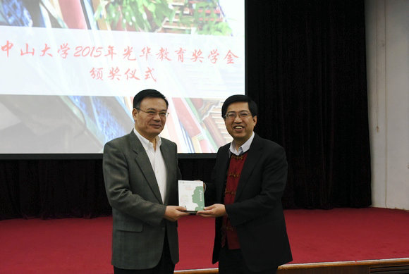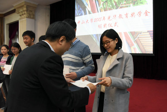 颜光美代表学校对光华教育基金会表示诚挚的感谢,并向获奖同学表示祝贺。他说,光华教育奖学金自1992年在我校设立以来,已有二十三年的历史,其设立主旨与我校“促进人心向学,不断追求卓越”的理念,以及学校人才培养目标“德才兼备、领袖气质、家国情怀”不谋而合。二十三年来,光华教育基金一直鼓励着中大学子奋发向学,热爱国家,心怀天下。颜光美表示,希望同学们能够高举梦想之灯,肩负起相应的社会责任,不辜负光华奖学金捐助者的殷切期望,在中山先生精神的激励下,在社会各界的关怀中,勤奋好学、努力探索、大胆创新。