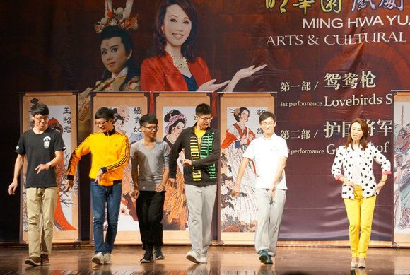 明华园戏剧总团的当家台柱、台湾歌仔戏“无敌小生”孙翠凤即兴指导观众进行歌仔戏中的身段表演