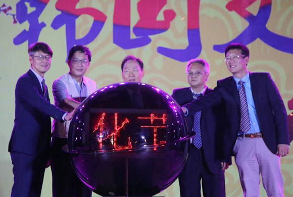 大韩民国驻广州总领事馆黄淳泽总领事(中)、韩国旅游发展局广州办事处申载久局长(左一)、珠海市文化体育旅游局邬向明副局长(右一)、我校马骏副校长(右二)、翻译学院王宾学术行政总监(左二)共同按下水晶球启动第十届韩国文化节