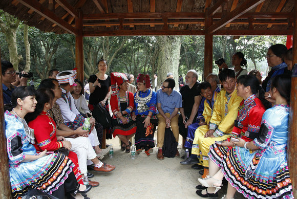 营员们体验阳朔山歌节,我校英语创意写作研究中心主任、外国语学院英语系主任戴凡(前排左六)用英语为营员们进行介绍
