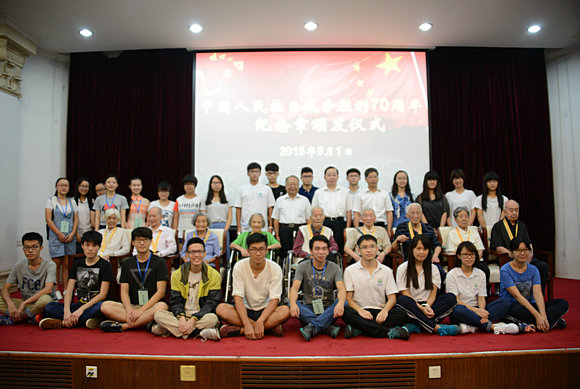 参加颁发仪式的校领导、抗战老战士代表、学生代表合影
