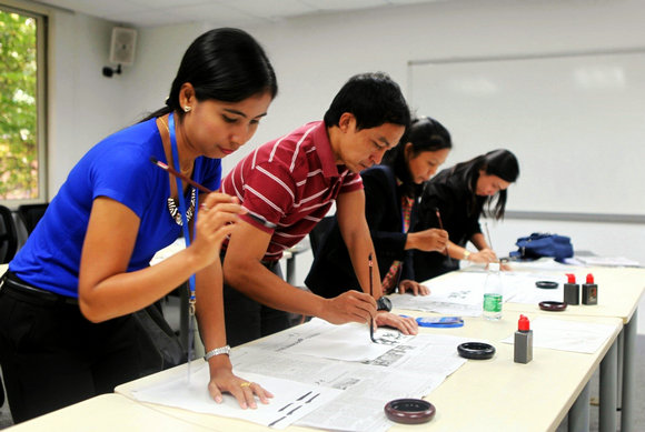 代表团成员在上书法课