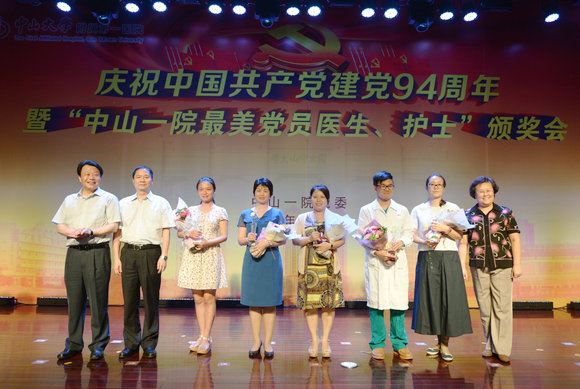 我校附属第一医院(以下简称“中山一院”)于七一前夕举行了“中山一院最美党员医生、护士”颁奖会,庆祝中国共产党建党94周年。我校副校长余敏斌在会上高度肯定了中大医科在教书育人方面做出的巨大贡献和对优秀文化的传承。中央电视台2014“寻找最美医生”活动获奖者——中大医科校友陈建屏、邓艳琴、刘隽和附属第一医院医生詹红作为特邀嘉宾在会上接受访谈,讲述了对母校感恩情怀和对“医病医身医心,救人救国救世”祖训的深刻理解及践行感悟。此次“最美党员医生、护士”评选活动得到了18万多人次关注,投票数达80多万,颁奖会揭晓并表彰了“中山一院最美党员医生、护士”各10名,“中山一院最美党员医生、护士”提名奖各10名。附属第一医院院长、党委书记肖海鹏号召全医院职工向先进人物学习,弘扬正能量,为中山一院的美好明天努力奋斗。