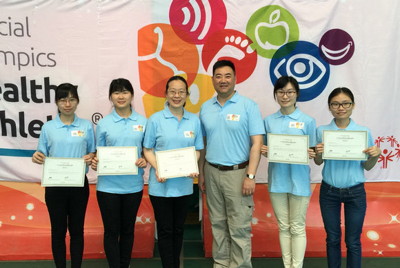 国际特殊奥林匹克运动会东亚区健康计划髙级经理詹骅(右三)为我校附属口腔医院的专业团队颁发国际特殊奥林匹克运动会志愿者证书