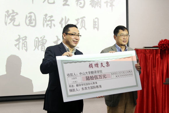 捐赠仪式上,王伟(左)代表东西方国际教育向我校翻译学院捐款,王宾(右)代表学院接受捐赠