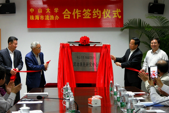 何建国、周成分别代表双方签署合作协议。刘嘉文、马骏、周成、何建国共同为流动渔民研究中心揭牌。