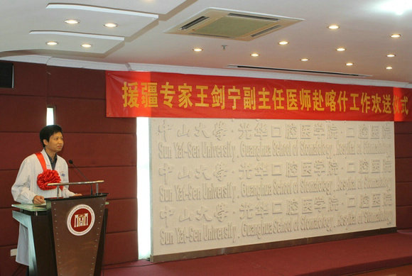 医院口腔颌面外科主任廖贵清代表科室致辞。他说,王剑宁同志欣然接受援疆任务,承担口腔颌面外科作为国家临床重点专科的应有责任,希望王剑宁为提高新疆地区人民的医疗保障水平做出贡献。