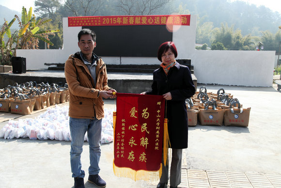2月11日至12日,“2015年新春献爱心送健康活动”在梅州大埔县枫朗镇坎下村进行,此次活动由广东省机构编制委员会办公室、广东省扶贫开发协会与附属第六医院联合开展。根据当地居民卫生健康情况,医院组织专家面向村民群众开展义诊义检、赠医送药活动,现场把脉问诊,普及健康和疾病预防知识,并为村级卫生站配送部分常用医疗器械。广东省编制办主任潘享清、广东省扶贫协会常务副秘书长钟韶彬称赞附属第六医院医疗队“不远千里送爱心,尽显白求恩精神”。